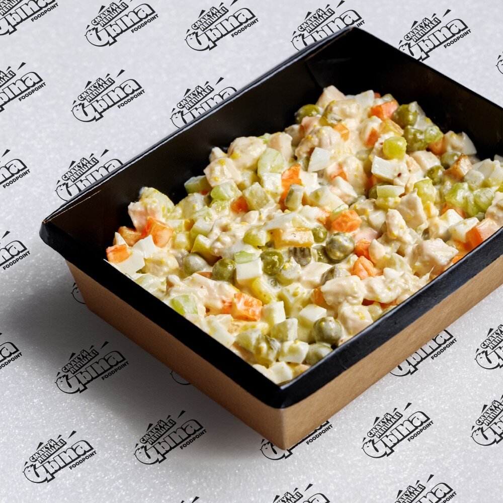 Отварной картофель и морковь, свежий и маринованный огурец, сочная куриная грудка, яичный белок и зелёный горошек. Заправлен фирменным домашним майонезом