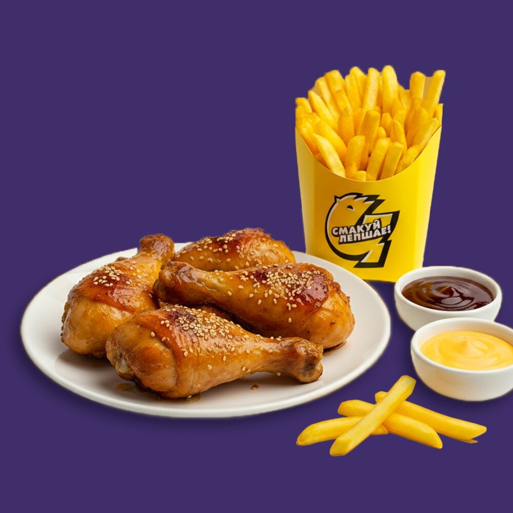 Запеченные куриные ножки с большой порцией картофеля фри, соусом пекин и вторым соусом на выбор
